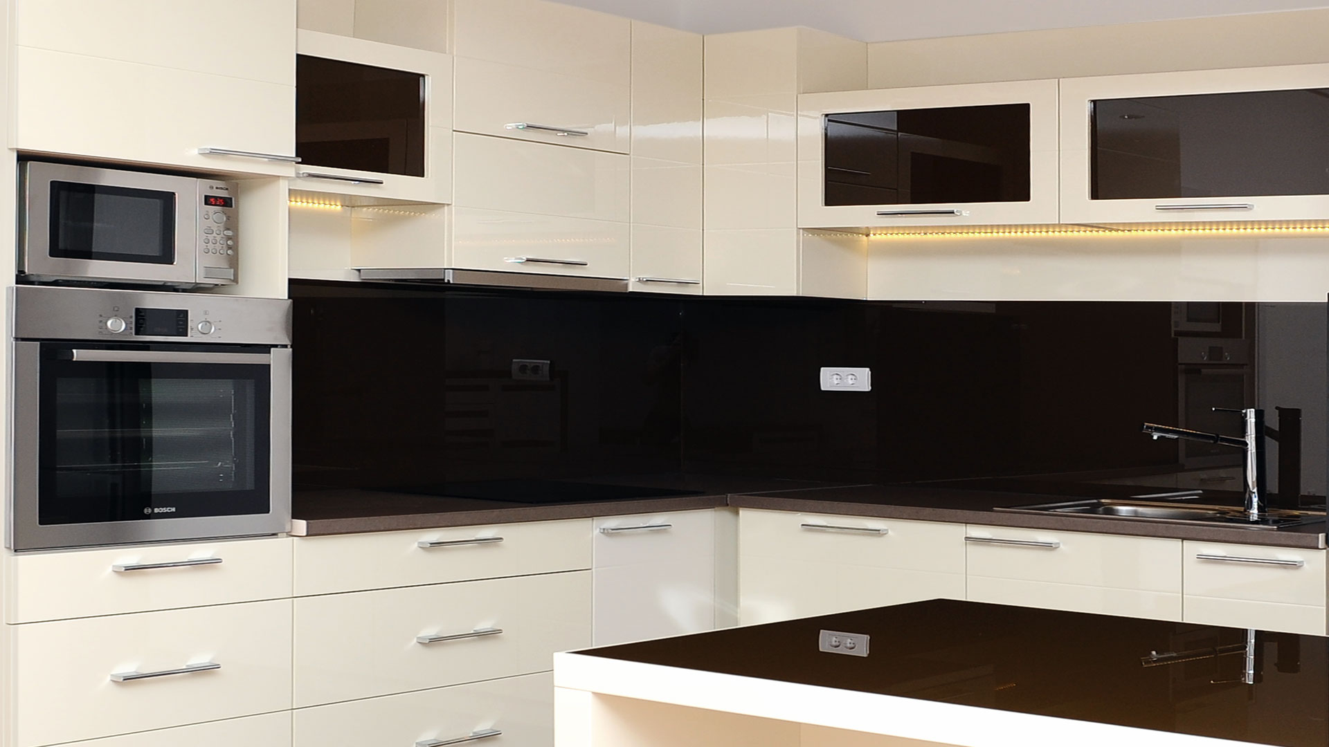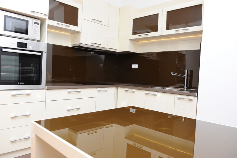 This kitchen has a glass area between the top and lower cupboards as well as a table with coloured glass top. It is painted in elegant beige with calming smoked glass.