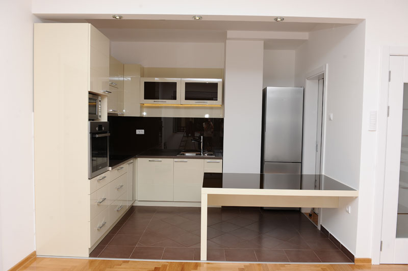 This kitche belongs to type 'L' with well planned work zones. The bottom drawers have equipment, the top cuoboards have slow- motion lifting systems.