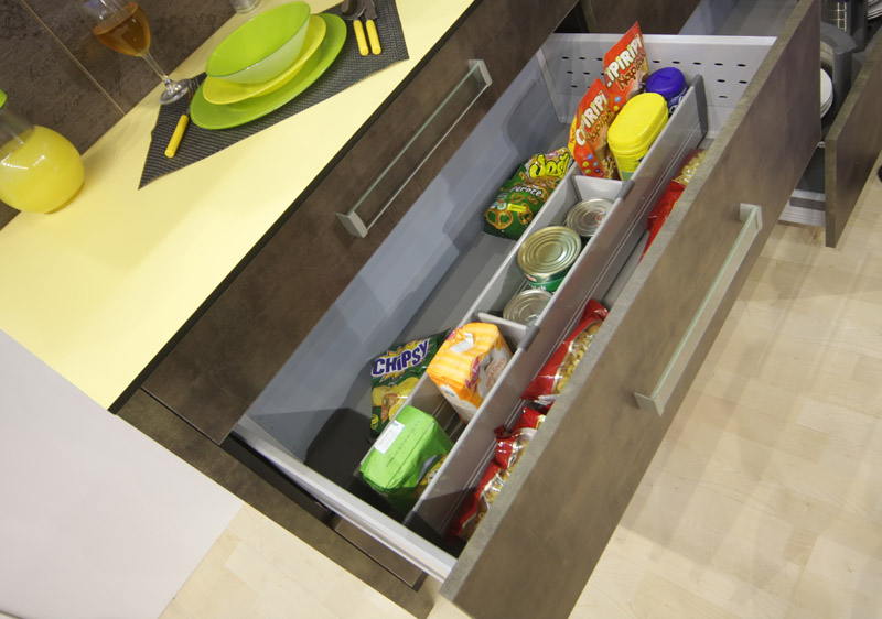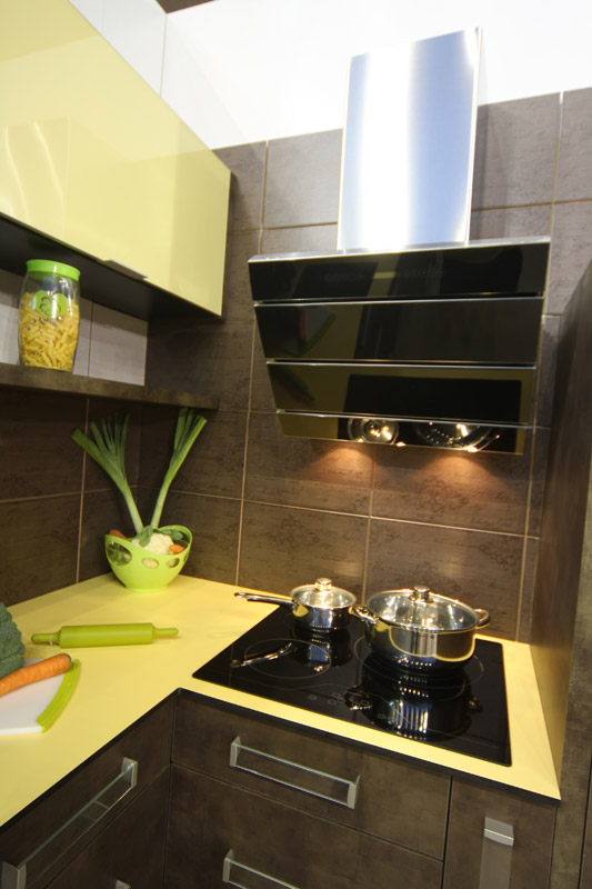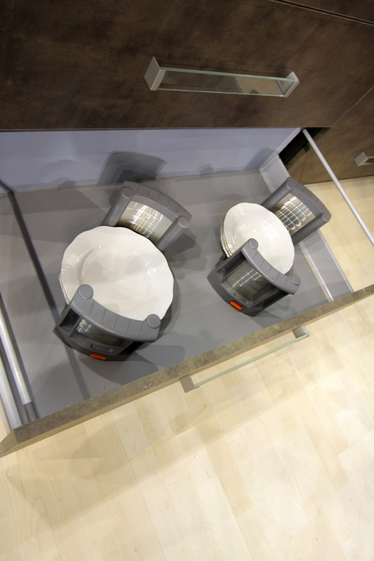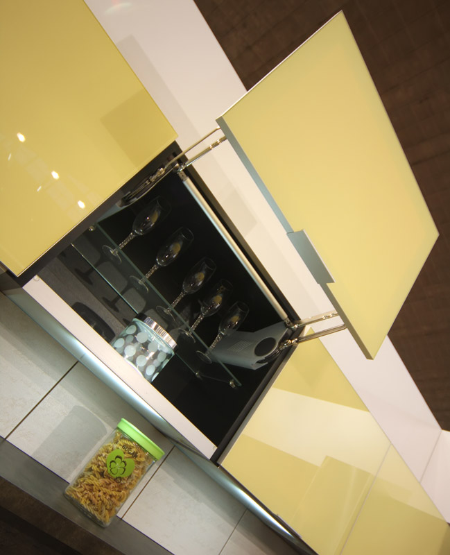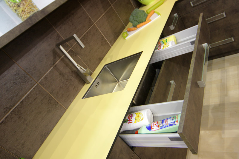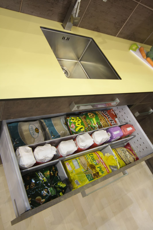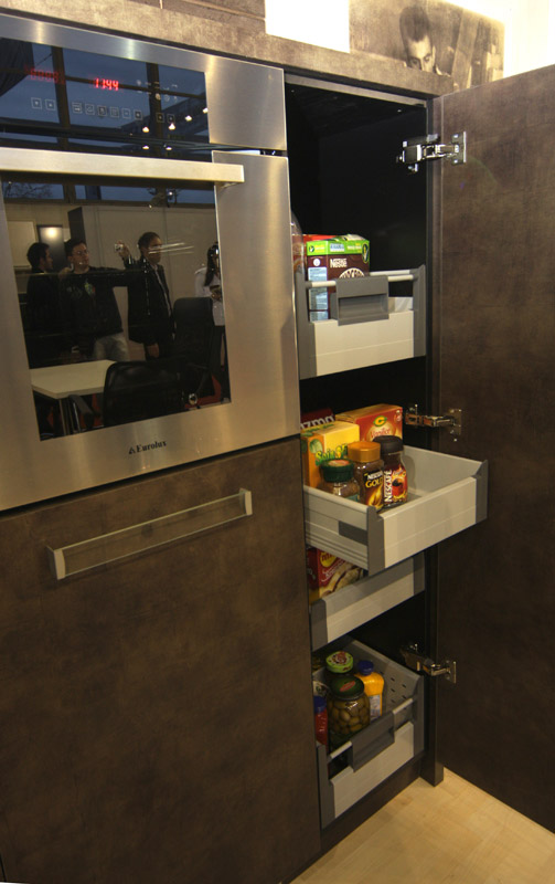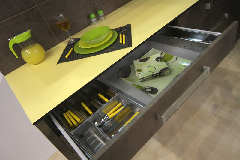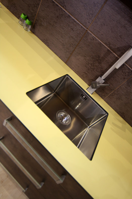 The worktop is made of 10mm thin compact plate with built-in sink.The fittings are made by 'Blum' from Austria with a life-term guarntee for fittings There is a 'space corner' and all the fitting have a slow motion closing.The handles are transparent and the top parts have lighting. W were given mark 10 from the visitors at the Belgrade fair in 2011.