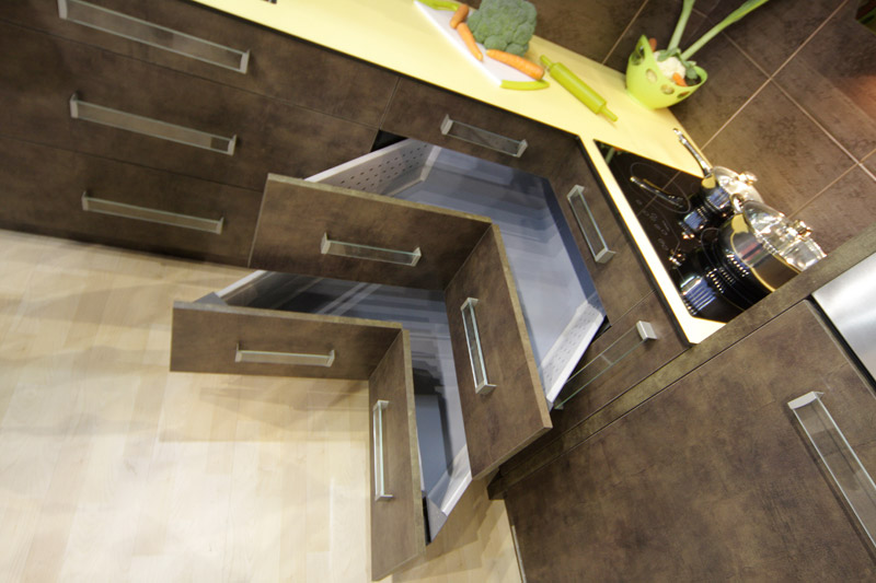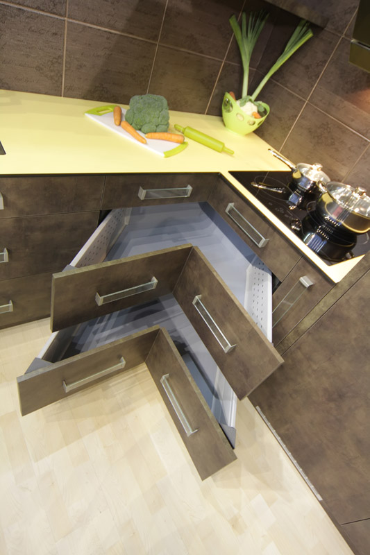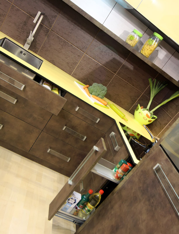 This kitchen is very modern in every aspect. It has been boldly designed with bronze as main decor that look old-fashioned, and in combination with modern materials- compacts worktops, lighting in detail and fittings, the zones and a perfect solution for the "dead" corner, this kitchen is superb.