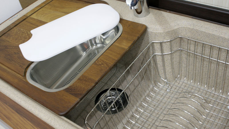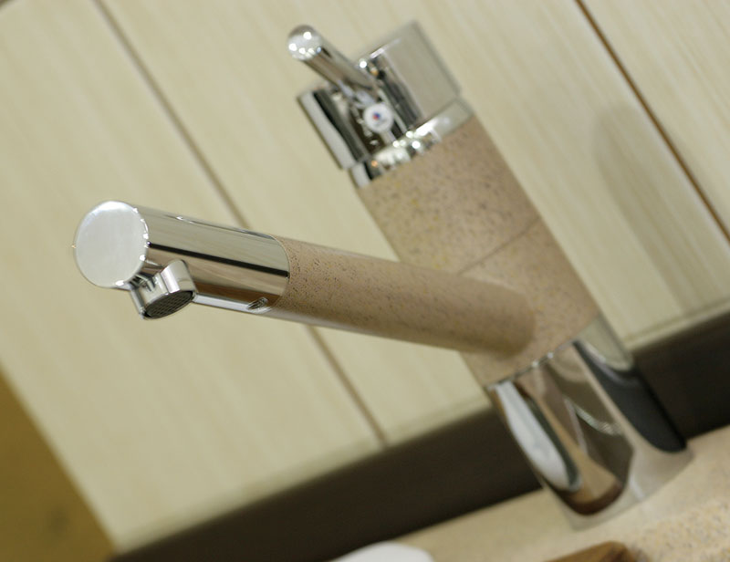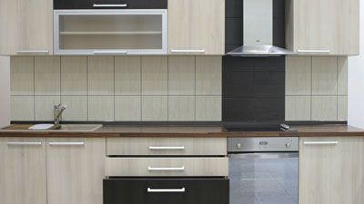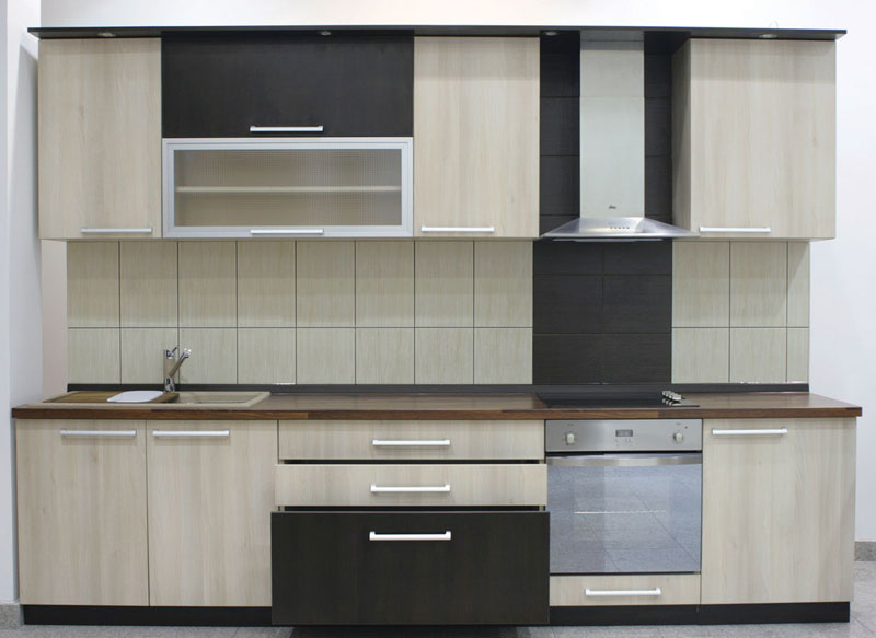 This is a type of lined kitchen with is often made wit us. It is made of univeer by "Kaindl" from Austria and it has a calm wooden decor in its light and dark shade. The tiles follow this trend and match perfectly.The sink and the faucet are made of granite by "Telma" , antibacterial, with additional equipment. With rightly planned zones, this kitchen is perfectly simple and as such meets the design and functionality.