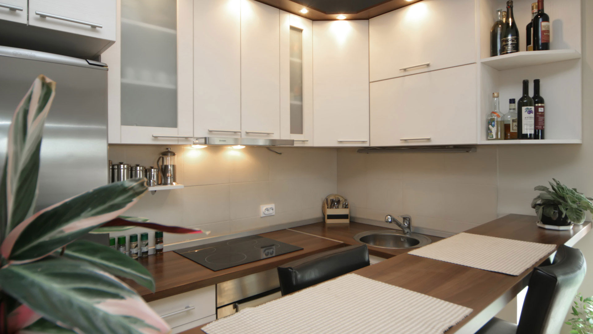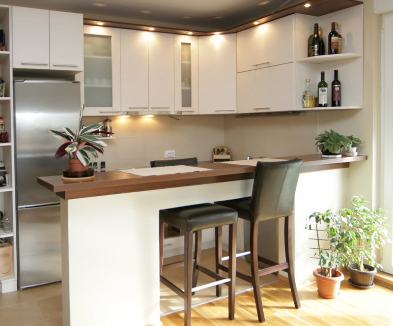 It is always a challenge to use little space cleverly and to achieve function and harmony in design. Kitchen "Hacijenda" makes the right example. With its well-planned setup, white wooden decor with a hint of brown. A bar with chairs, make this kitchen one of the best kitchens for such areas.
