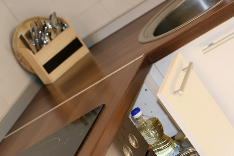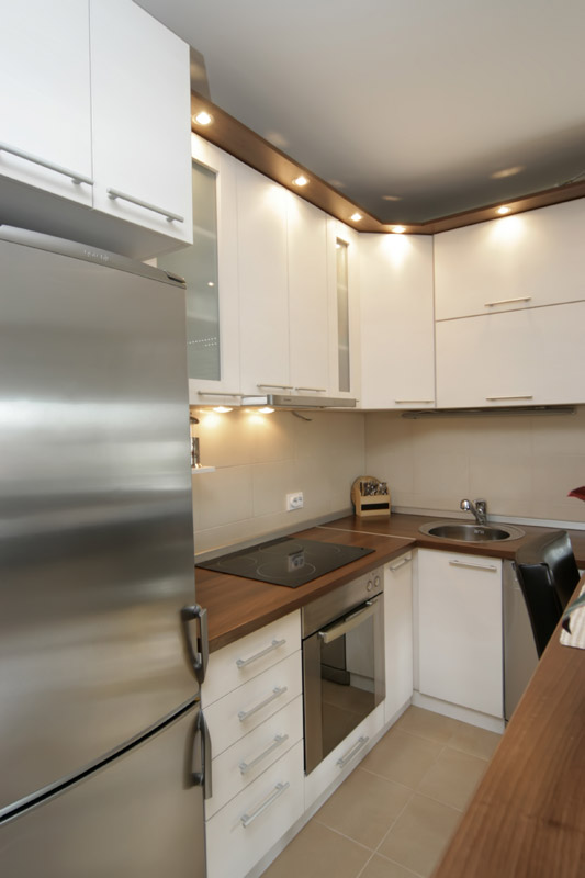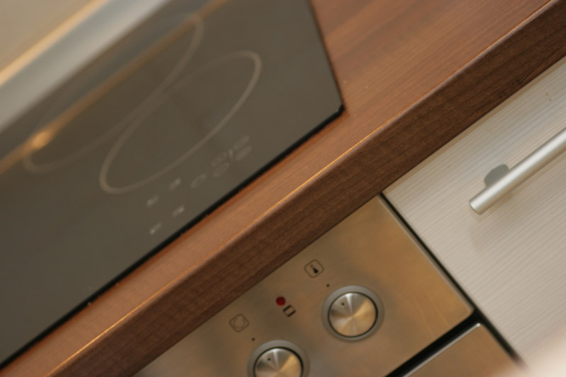 IT is made of univeer by Austrian "Egger" with modern fittings and complete built-in technique. The kicthen has a slide door in the same pattern that divides the kitchen from the rst of the flat.