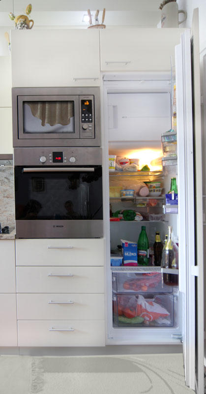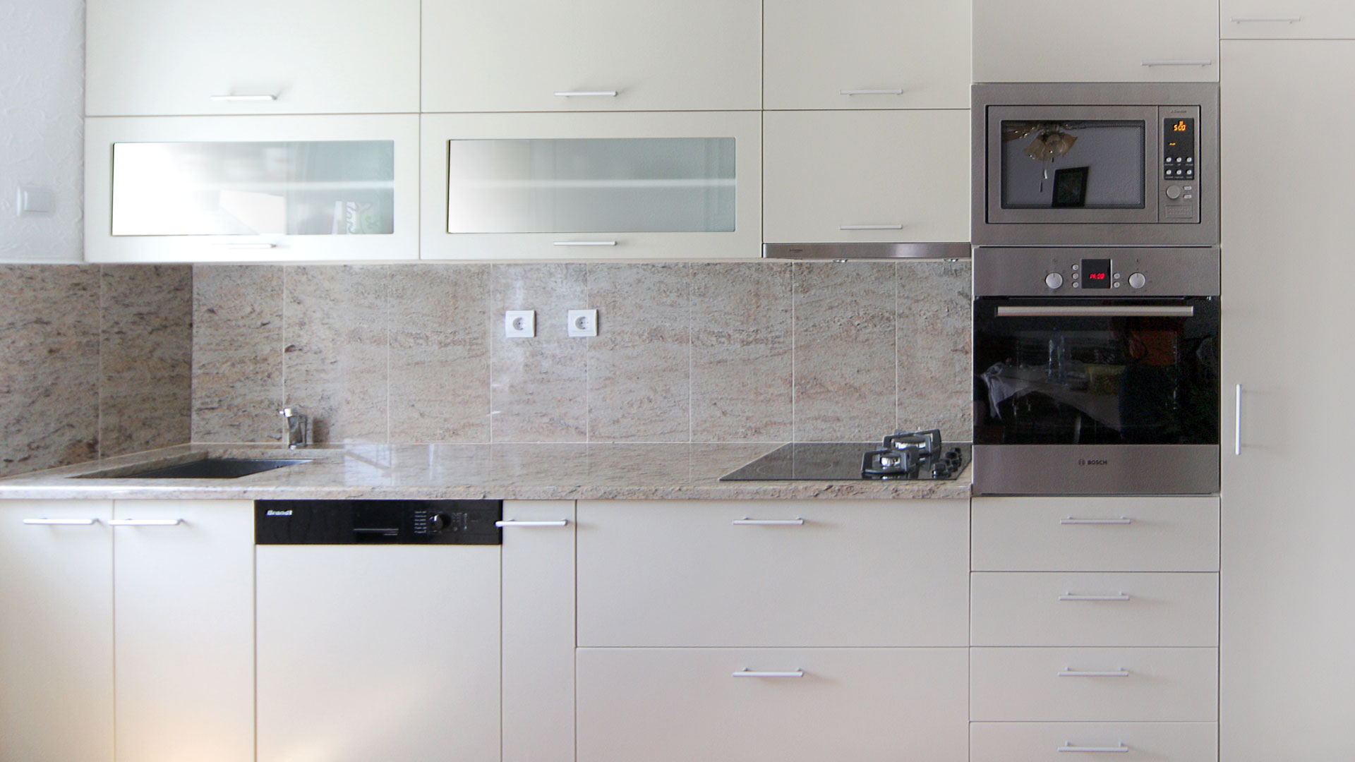 Kitchen "Whitish" is a type of lined, spacy kitchen, with all work zones. It is made from white univeer "Kaindl" of high quality, with a combination of glass frames. The marble worktop and built-in sink give this kitchen a modern look. Lifted oven and microwave make thier everyday usage easier, as well as the drawers in lower cupboards. The top cupboards have slowmotion lifters.